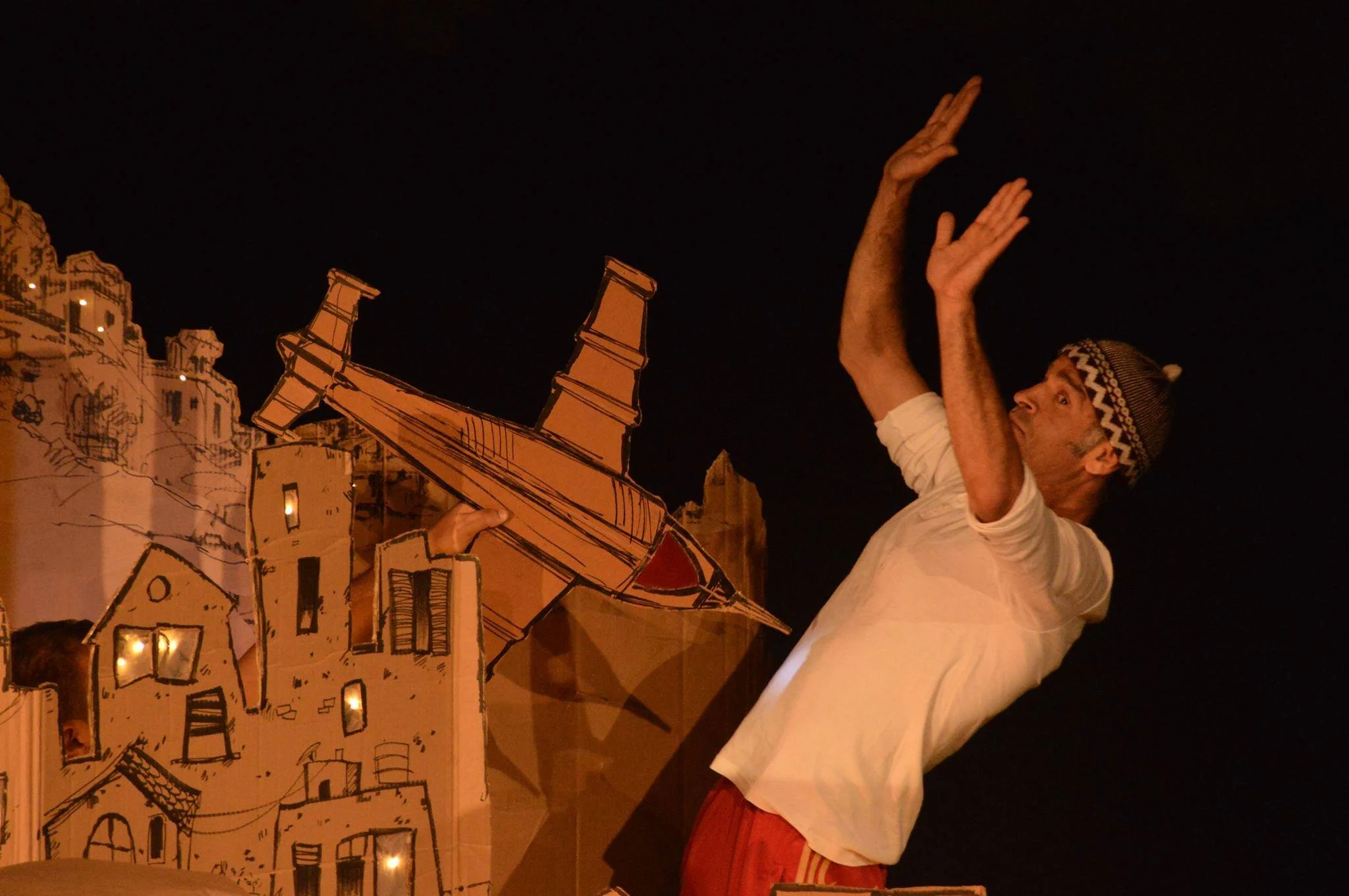 This silent performance, laced with dark humour, bends the rules of puppet theatre, where stage props and settings—crafted from cardboard—become puppets themselves.